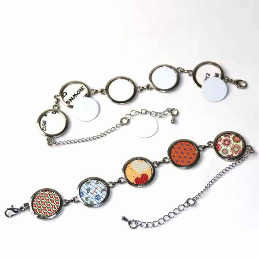 High quality 23cm silver coloured metal bracelet for sublimation, size can be reduced at clasp to 17cm, round photos/designs. Comes with 5 small round sublimation discs approx. 17mm across